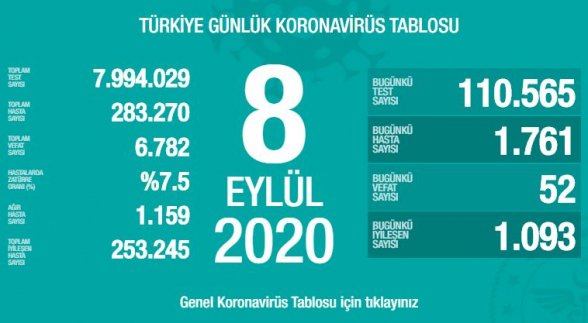 Թուրքիայում սեպտեմբերի 8-ին նոր տիպի կորոնավիրուսից (Covid-19) մահացել է 53 մարդ։ Այդ մասին տեղեկություն է հրապարակված Թուրքիայի առողջապահության նախարարության կայքէջում։