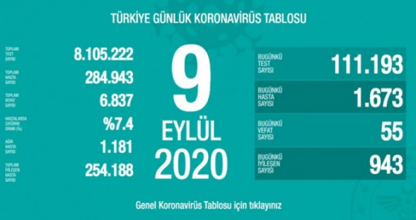 Թուրքիայում սեպտեմբերի 9-ին նոր տիպի կորոնավիրուսից (Covid-19) մահացել է 55 մարդ։ Այդ մասին տեղեկություն է հրապարակված Թուրքիայի առողջապահության նախարարության կայքում։