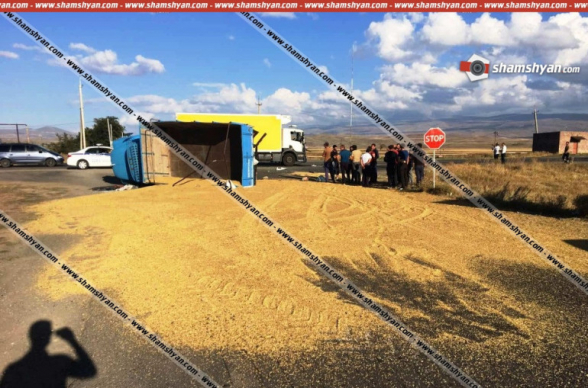Երևան-Գյումրի ավտոճանապարհին բախվել են MAN և ЗИЛ մակնիշի բեռնատարները. ցորենով բարձված ЗИЛ-ը կողաշրջվել է