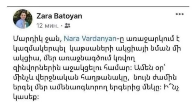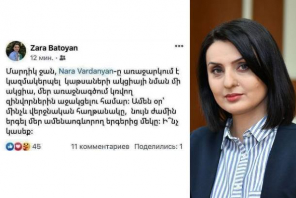 Աշխատանքի և սոցիալական հարցերի նախարար, ՔՊ վարչության անդամ Զարուհի Բաթոյանի՝ նախօրեի «կաթսայա-ֆլեշմոբային» գրառումը շատերին հունից հանեց: Նախարարն իր ֆեյսբուքյան պատին գրել էր, թե`առաջարկ կա կազմակերպել «կաթսաների ակցիայի նման մի ակցիա, մեր առաջնագծում կռվող զինվորներին աջակցելու համար: Ամեն օր՝ մինչև վերջնական հաղթանակը, նույն ժամին երգել մեր ամենաոգևորող երգերից մեկը: Ի՞նչ կասեք»:
