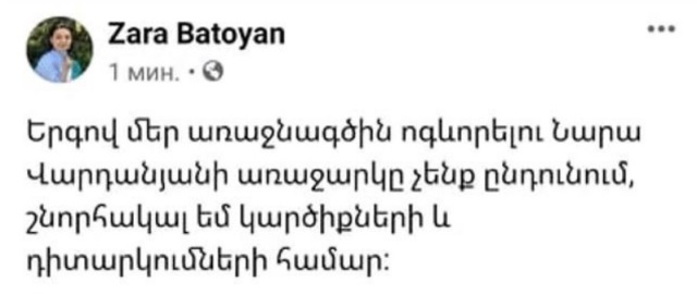 Զարուհի Բաթոյանն էլ դա արագ հասկացավ ու որոշ ժամանակ անց նրա պատին հայտնվեց մի «նեյտրալ» գրառում, թե՝ հիշյալ առաջարկը «չենք ընդունում, շնորհակալ եմ կարծիքների և դիտարկումների համար»:
