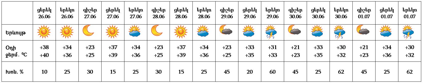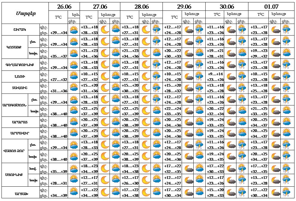Պայմանավորված արաբական անապատներից արևադարձային տաք օդային հոսանքների ներթափանցմամբ՝ հունիսի 26-28-ը հանրապետության ողջ տարածքում սպասվում է խիստ բարձր ջերմային ֆոն, Արարատյան դաշտում և նրա նախալեռներում, Վայոց ձորի նախալեռներում, Սյունիքի հովտային գոտում և Երևանում ցերեկային ժամերին սպասվում է +38․․․+40 աստիճան։ Հունիսի 26-ից հուլիսի 1-ը նշված գոտիներում սպասվում է նաև բարձր կարգի հրդեհավտանգ իրավիճակ: