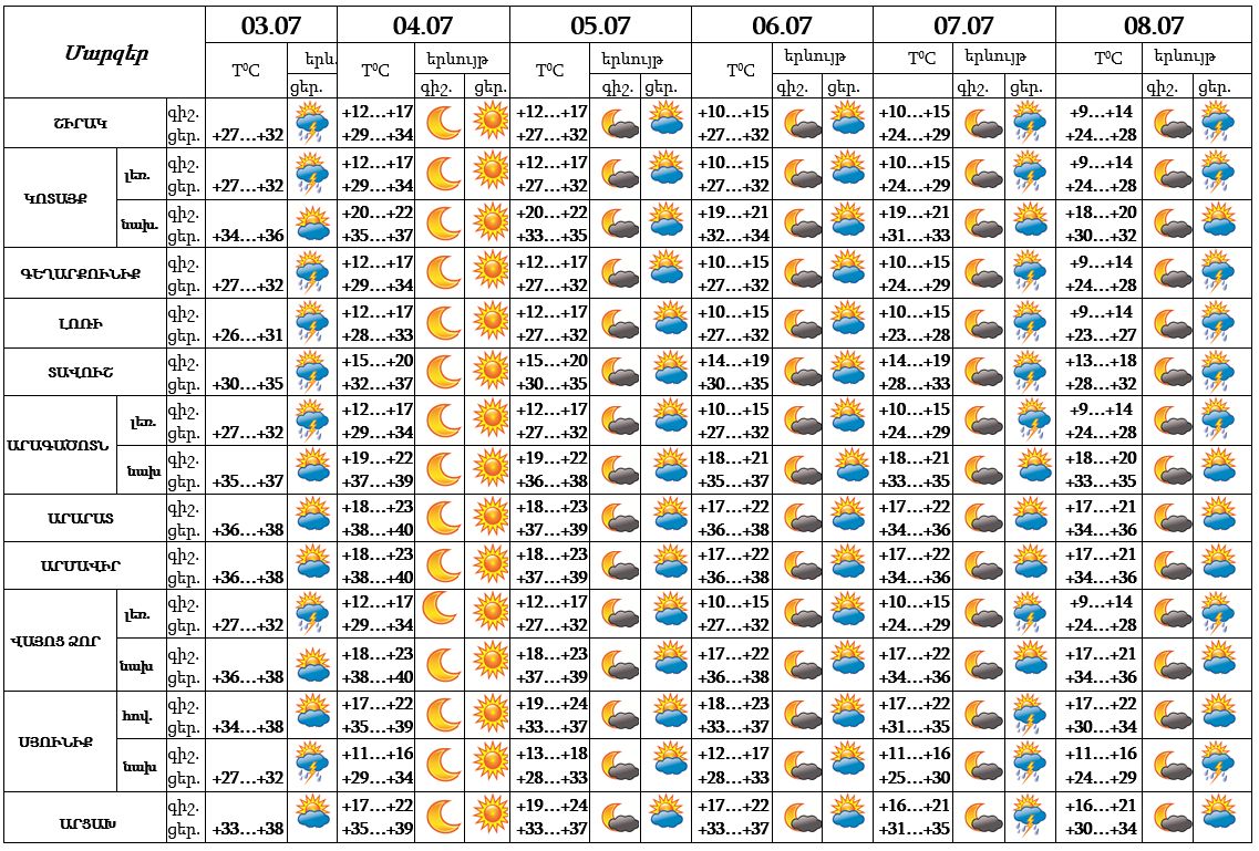 Երևան քաղաքում՝ hուլիսի 3-ին, 7-8-ը երեկոյան ժամերին քաղաքի առանձին հատվածներում սպասվում է կարճատև անձրև և ամպրոպ, ամպրոպի ժամանակ քամու ուժգնացում՝ 15-20 մ/վ: Հուլիսի 4-6-ը սպասվում է առանց տեղումների եղանակ: