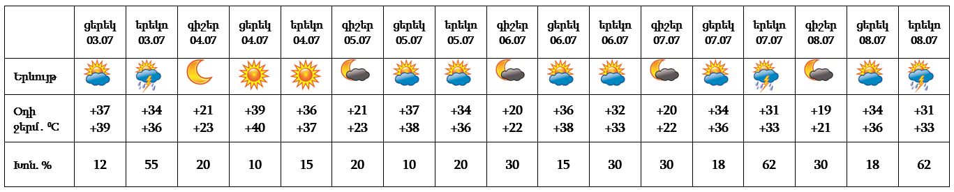 Օդի ջերմաստիճանը հուլիսի 3-4-ի ցերեկն աստիճանաբար կբարձրանա 3-4 աստիճանով, այնուհետև 5-8-ի ցերեկը նույնքան կնվազի։