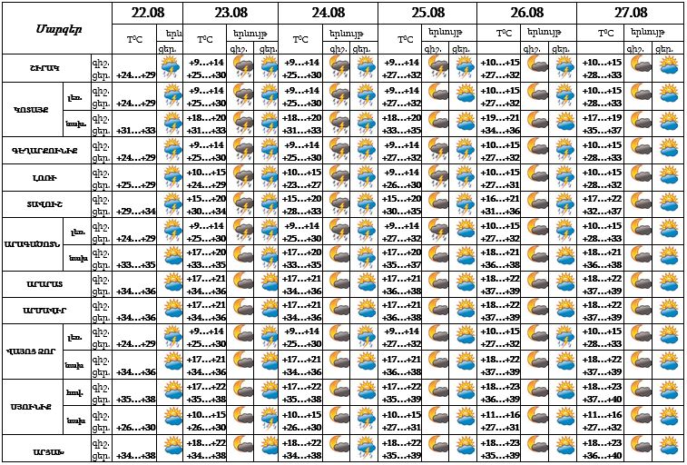 Հանրապետության տարածքում oգոստոսի 22-ի ցերեկը, 23-26-ին` գիշերը և կեսօրից հետո առանձին շրջաններում սպասվում է կարճատև անձրև և ամպրոպ, առանձին հատվածներում հնարավոր է նաև կարկուտ։ Օգոստոսի 27-ին սպասվում է առանց տեղումների եղանակ: