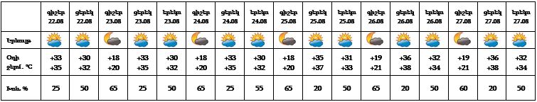 Օդի ջերմաստիճանն օգոստոսի 25-27-ի ցերեկն աստիճանաբար կբարձրանա 3-4 աստիճանով: