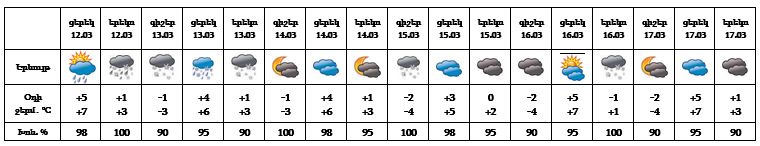 Մարտի 12-ի ցերեկը, 13-ին, 15-ի գիշերը, 16-ին ժամանակ առ ժամանակ շրջանների զգալի մասում, 14-ին, 15-ի և 17-ի ցերեկը Հանրապետության առանձին շրջաններում սպասվում են տեղումներ, առանձին հատվածներում՝ ինտենսիվ: Տեղումները լեռնային և նախալեռնային շրջաններում սպասվում են ձյան տեսքով: Լեռնային առանձին շրջաններում սպասվում է բուք, ցածր հորիզոնական տեսանելիություն։