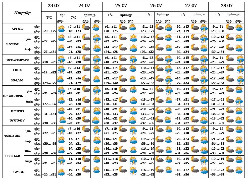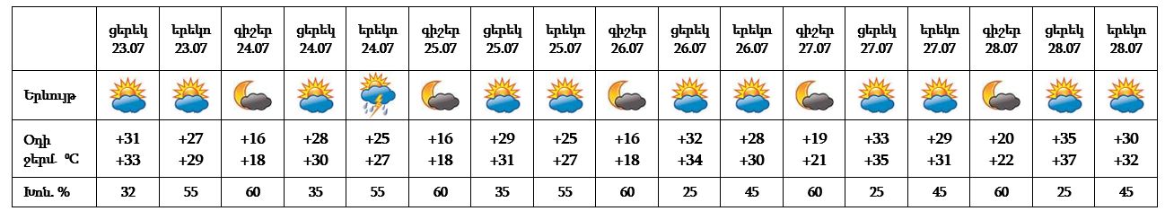 Երևան քաղաքում՝ հուլիսի 23-ի ցերեկը, 25-28-ը սպասվում է առանց տեղումների եղանակ: Հուլիսի 24-ի երեկոյան ժամերին քաղաքի առանձին հատվածներում հնարավոր է կարճատև անձրև և ամպրոպ: Երեկոյան ժամերին սպասվում է քամու ուժգնացում՝ 15-18 մ/վ արագությամբ: