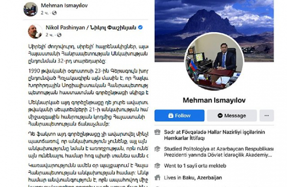 Մասնավորապես, Ադրբեջանի արտակարգ իրավիճակների նախարարության արհմիության ղեկավարը ֆեյսբուքյան իր էջում կիսվել է Նիկոլ Փաշինյանի՝ այսօր իր էջում հրապարակած Անկախության հռչակագարի ընդունման օրվան նվիրված գրառման տեքստով ուղիղ բնօրինակից: