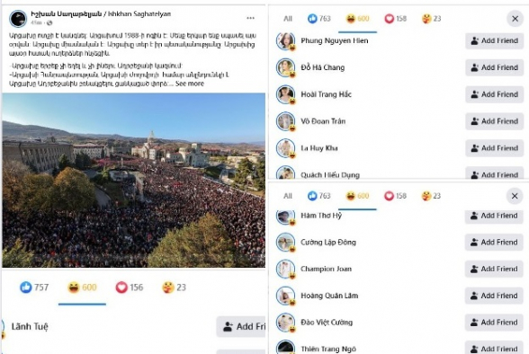 Պարզվեց, որ գրառումը ծիծաղելի է թվացել Դոնգ Վայ Լային, Հույ Վու Տունին, Թանհ Հույեն Տռանին և էլի մի քանի հարյուր վիետնամացի «օգտատիրոջ»։ (Եթե չգիտեք, ապա կայքեր կան, որտեղ կարելի է վիետնամացի, պակիստանցի, նիգերիացի և մի շարք այլ երկրների օգտատերերի մի քանի հարյուր կամ հազար լայք պատվիրել)...