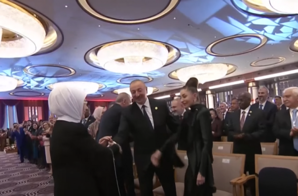 Կադրերում երևում է, թե ինչպես են Էրդողանն ու տիկինը նախ ողջունում առաջին շարքում նստած Ալիևին ու տիկնոջը, ապա Էրդողանը բարևում է անմիջապես Ալիևի թիկունքում՝ երկրորդ շարքում նստած Նիկոլ Փաշինյանին։