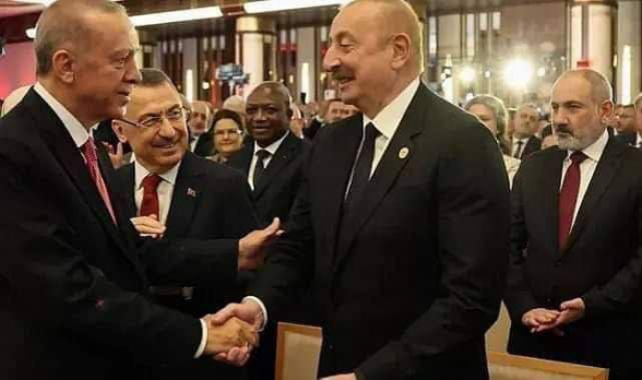 2,5 տարի առաջ այս երկուսը պայմանավորված ու բնական է՝ լավ պլանավորած հարձակվեցին փոքրիկ Արցախ պետության վրա: Էն հետևի կանգնածը, էս կողմից, իբր երաշխավոր լինելով, ամեն բան թարս արեց, ամենայն հավանականությամբ՝ որ այս երկուսի «գործը» հաջողի: Հիմա, այս երկուսը, որ իրար ձեռք են սեղմում, երրորդը հետևները կանգնած...ուշադրություն էլի...ծափ է տալիս: