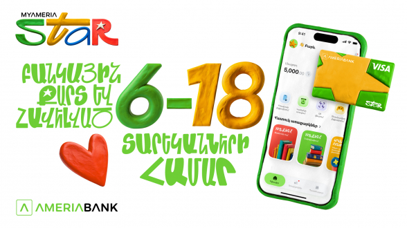 Ամերիաբանկը գործարկել է MyAmeria Star բանկային նոր հավելվածը՝նախատեսված 6-ից 18 տարեկանների համար։ MyAmeria Star-ն անվտանգ և հարմարավետ բանկային լուծում է երեխաների և դեռահասների համար՝ ծնողական ամբողջական վերահսկողության հնարավորությամբ։