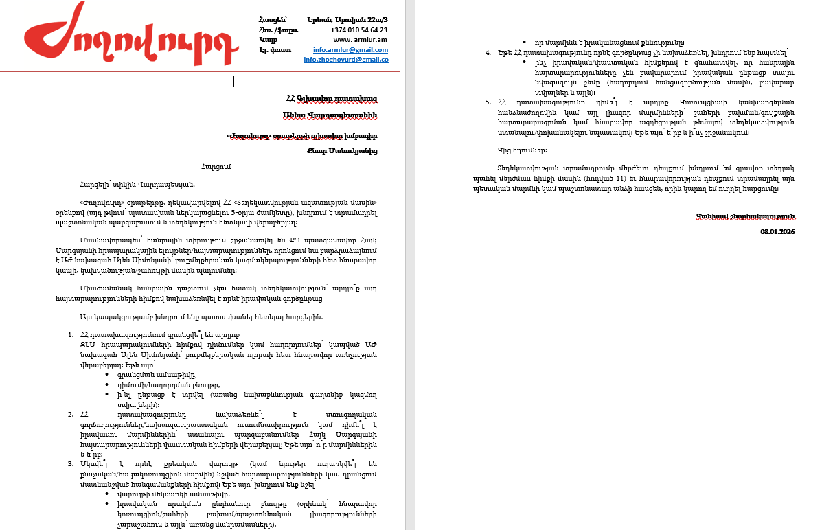 Այս տարվա հունվարի 8-ին «Ժողովուրդ» օրաթերթը ուղարկել էր հարցում ՀՀ գլխավոր դատախազին՝ հայտնելով, որ հանրային տիրույթում շրջանառվել են ՔՊ պատգամավոր Հայկ Սարգսյանի հրապարակային ելույթներ/հայտարարություններ, որոնցում նա բարձրաձայնում է ԱԺ նախագահ Ալեն Սիմոնյանի՝ բուքմեյքերական կազմակերպությունների հետ հնարավոր կապի, կախվածության/շահույթի մասին պնդումներ։