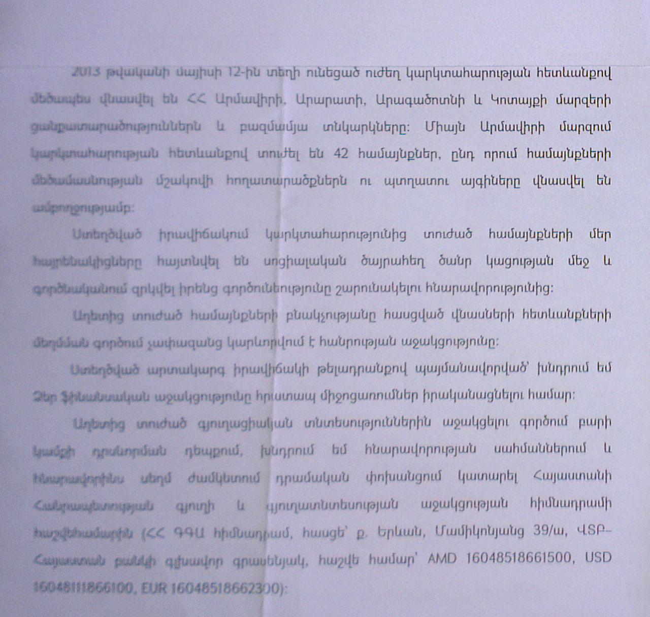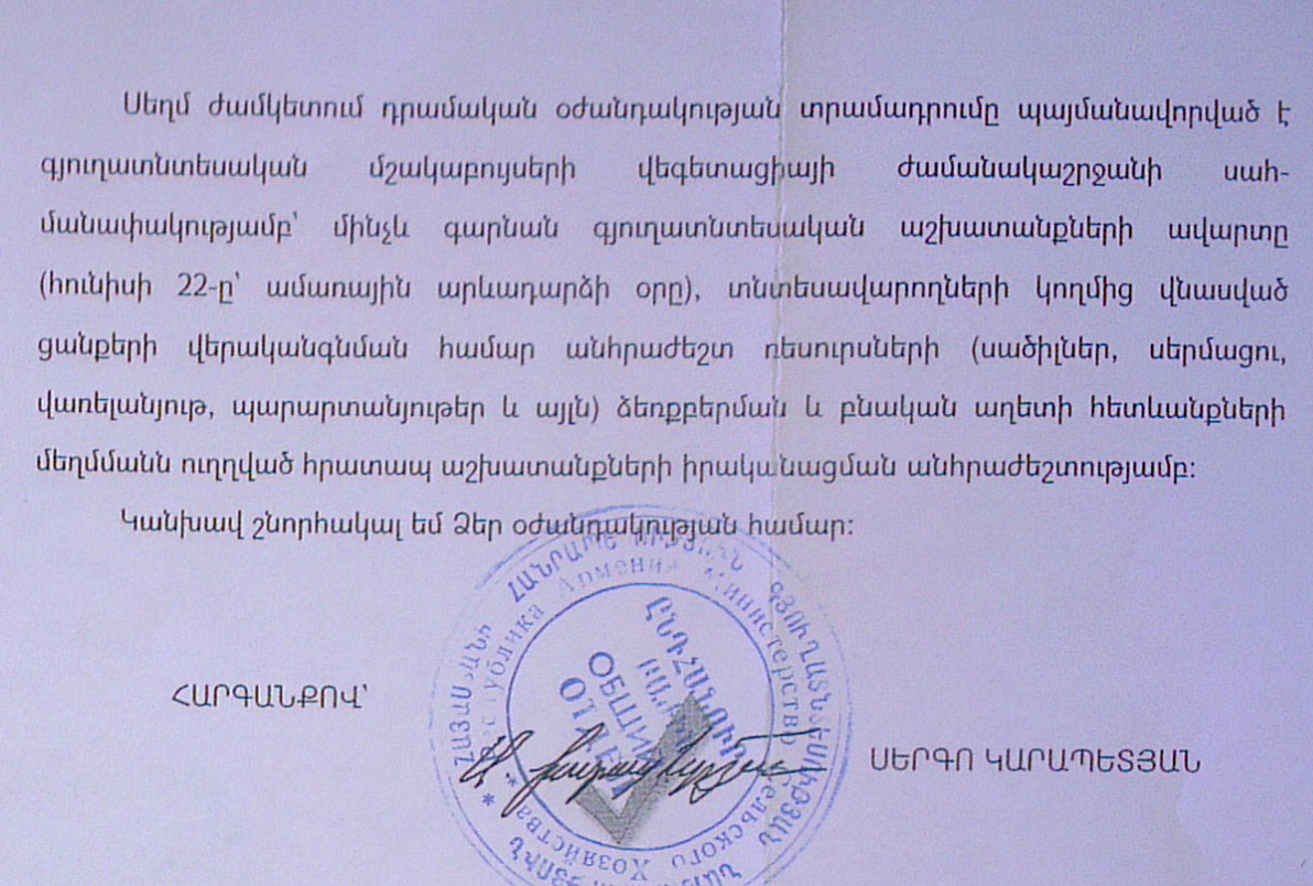 Galatv.am-ի տրամադրության տակ է հայտնվել մի փաստաթուղթ՝ ստորագրված ՀՀ գյուղատնտեսության նախարար Սերգո Կարապետյանի կողմից, որով ՀՀ իշխանությունները` ի դեմս Սերգո Կարապետյանի, իրենց ձեռքն են պարզում եւ օժանդակություն են խնդրում այն քաղաքացիներից, ովքեր ցանկություն ունեն օգնելու եւ հանգանակություն կատարելու փաստաթղթում նշված հաշվեհամարով: Հանգանակված գումարը, ըստ փաստաթղթի` գյուղնախարարությունը փոխանցելու է օրերս կարկտահարությունից տուժած տնտեսություններին՝ փոխհատուցելու վնասը: