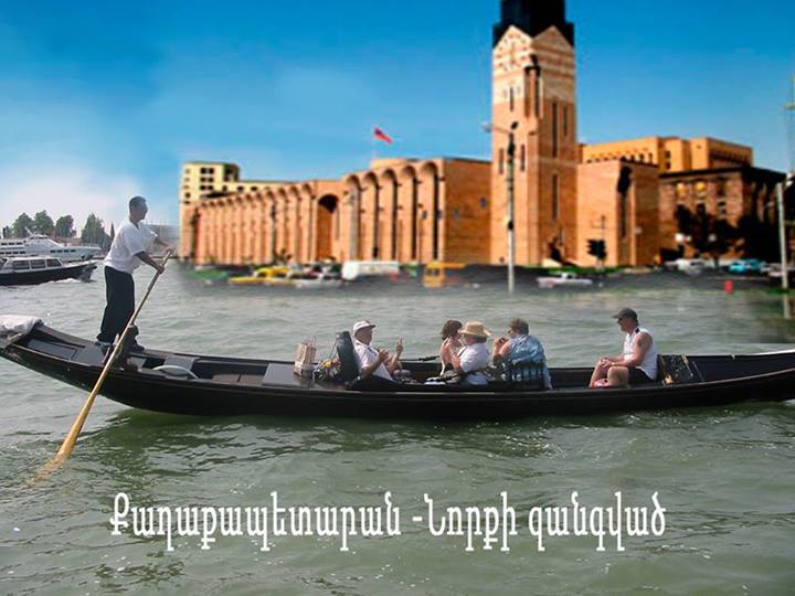 Հ.Գ. Հատուկ համագործակցության շնորհիվ քաղաքապետ Տարոն Գեղեցիկին հաջողվել է օպերատիվ կերպով Վենետիկից ներմուծել թվով 60 նավակ, որոնք վաղվանից կսպասարկեն Երևանի կենտրոնի մի քանի երթուղի»։