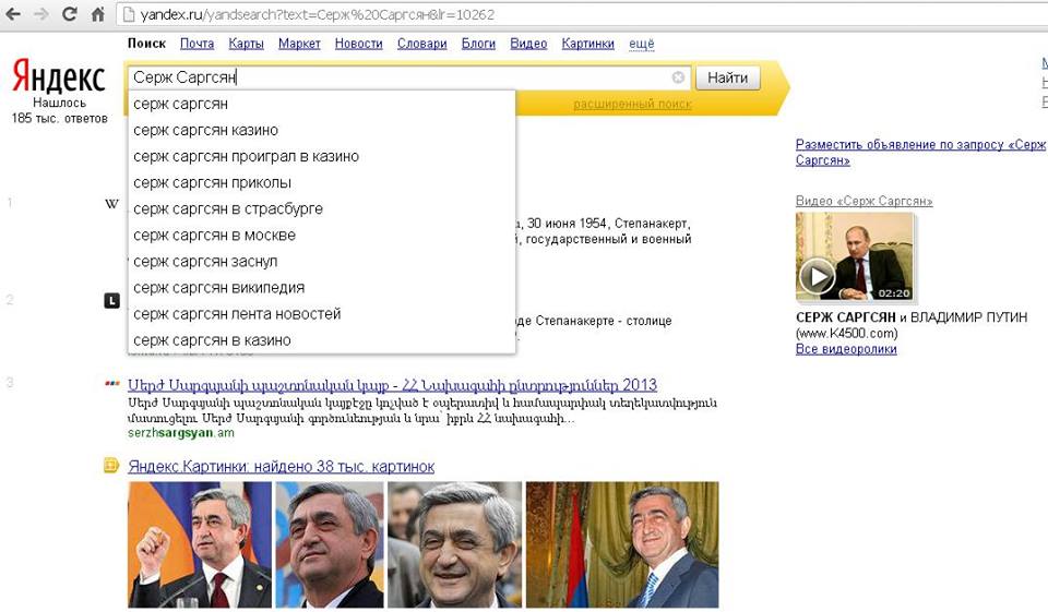 «Серж Саргсян казино», «Серж Саргсян заснул». «yandex.ru»–ի արձագանքը «Серж Саргсян»–ին։