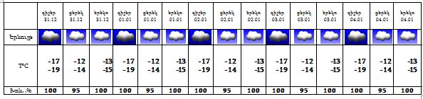 Դեկտեմբերի 31-ին և հունվարի 1-4-ին ժամանակ առ ժամանակ կդիտվի մառախուղ, թույլ ձյուն: