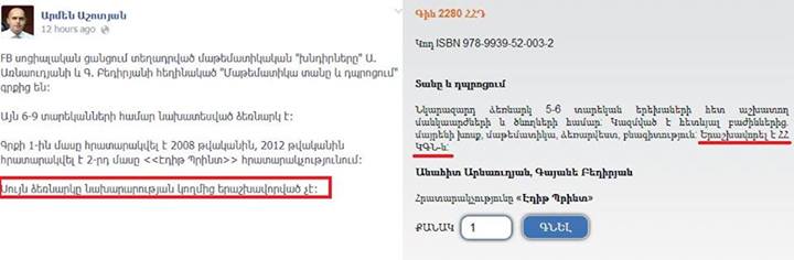 ՀՀ ԿԳ նախարար Արմեն Աշոտյանը ֆեյսբուքյան իր էջում գրել էր, որ սոցիալական ցանցում տեղադրված մաթեմատիկական «խնդիրները» Ա. Առնաուդյանի և Գ. Բեդիրյանի հեղինակած «Մաթեմատիկա տանը և դպրոցում» գրքից են: «Այն 6-9 տարեկանների համար նախատեսված ձեռնարկ է: Գրքի 1-ին մասը հրատարակվել է 2008 թվականին, 2012 թվականին հրատարակվել է 2-րդ մասը «Էդիթ Պրինտ» հրատարակչությունում: