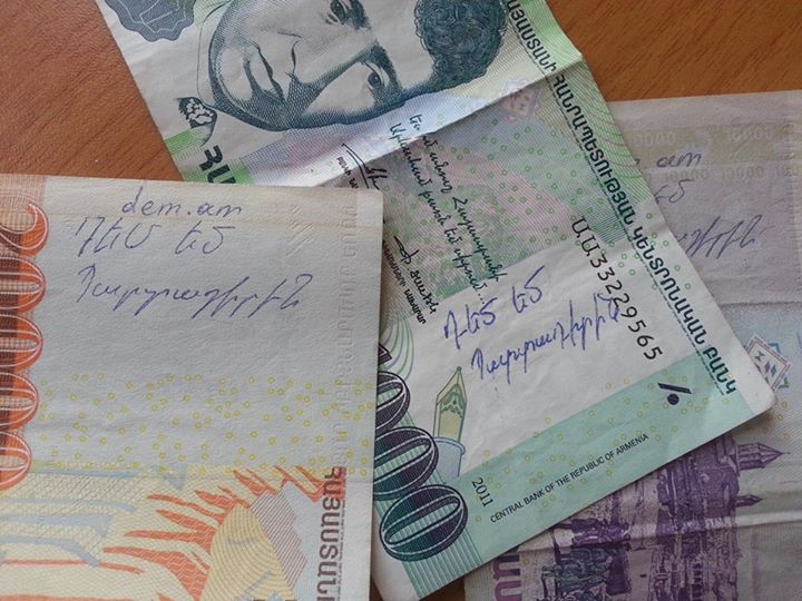 «Ֆեյսբուք» սոցիալական ցանցի օգտատեր Հակոբ Արշակյանը հայկական թղթադրամների լուսանկար է տեղադրել՝ մեկնաբանելով. «Շրջանառության մեջ են հայտնվել «դեմ եմ պարտադիրին» գրառումով թղթադրամներ»։