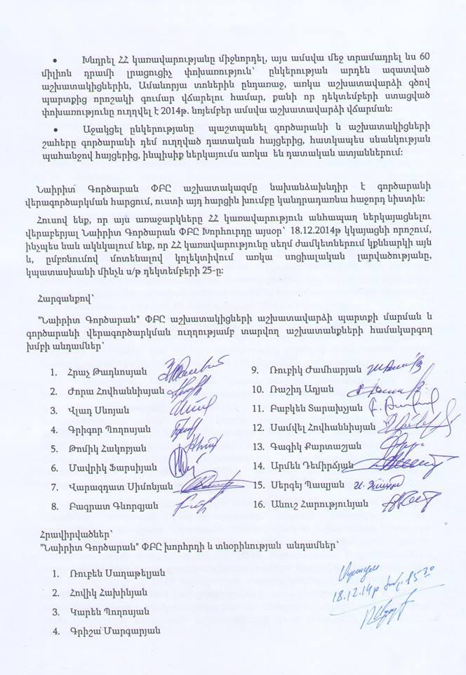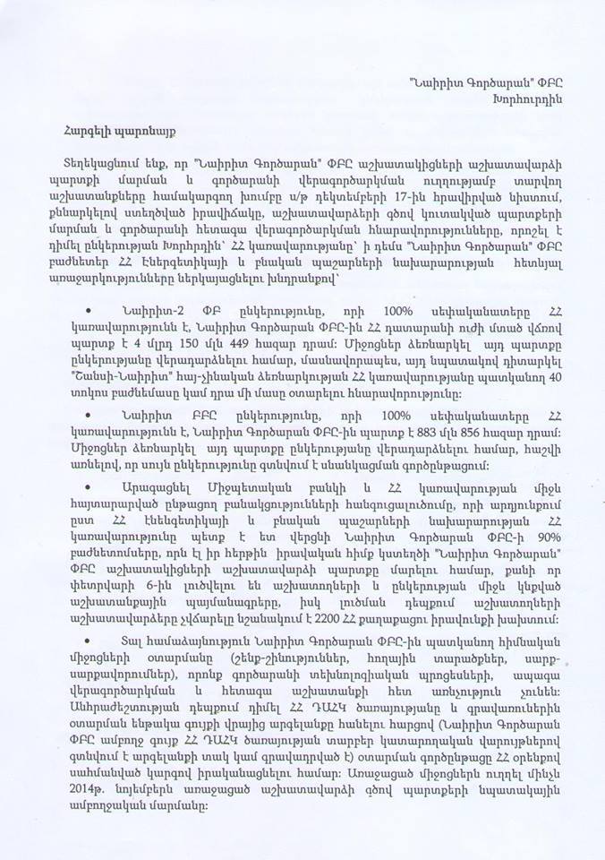 Տեղեկացնում ենք, որ «Նաիրիտ Գործարան» ՓԲԸ աշխատակիցների աշխատավարձի պարտքի մարման և գործարանի վերագործարկման ուղղությամբ տարվող աշխատանքները համակարգող խումբը սույն թվականի դեկտեմբերի 17-ին հրավիրված նիստում, քննարկելով ստեղծված իրավիճակը, աշխատավարձերի գծով կուտակված պարտքերի մարման և գործարանի հետագա վերագործարկման հնարավորությունը, որոշել է դիմել ընկերության Խորհրդին՝ ՀՀ կառավարության՝ ի դեմս «Նաիրիտ Գործարան» ՓԲԸ բաժնետեր ՀՀ Էներգետիկայի և բնական պաշարների նախարարություն՝ հետևյալ առաջարկությունները ներկայացնելու խնդրանքով ...