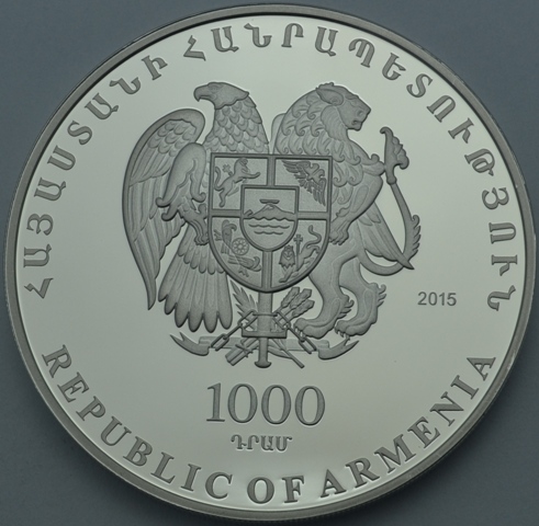 Հուշադրամի դիմերեսին պատկերված է Հայաստանի Հանրապետության զինանշանը: Մակագրություններն են` «Հայաստանի Հանրապետություն», «Republic of Armenia», «1000 դրամ», «2015»: