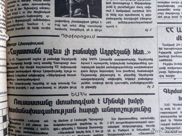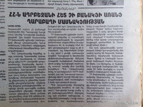 «Հայաստանն այլևս չի բանակցի Ադրբեջանի հետ Ղարաբաղի հարցի շուրջ՝ առանց Ղարաբաղի մասնակցության: Այս մասին հայտարարեց ՀՀ նախագահի գլխավոր խորհրդական Ժիրայր Լիպարիտյանը, ելույթ ունենալով Լոնդոնում անցկացվող «Անդրկովկասի հեռանկարները» խորհրդաժողովում: Պրն. Լիպարիտյանը հայտնեց, որ այդ որոշումը Հայաստանը կայացրել է այն պատճառով, որ, ինչպես ցույց տվեց Լիսաբոնի ԵԱՀԿ գագաթաժողովը, Ադրբեջանը ձգտում է օգտագործել երկկողմանի հանդիպումները ղարաբաղյան կողմին բանակցություններից աստիճանաբար դուրս մղելու նպատակով: Նրա խոսքերով,ժամանակին Հայաստանը ընդառաջեց և ընդունեց Ադրբեջանի առաջարկությունը՝ անցկացնել երկկողմ բանակցություններ, որպեսզի փորձի դյուրացնել բանակցությունների ընթացքը» (տես՝ հոդվածին կից լուսապատճենները):