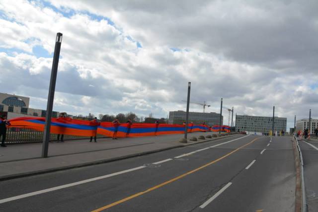 Ապրիլի 3-ի կեսօրին Բեռլինի կենտրոնում գտնվող Ռեյխսթագի շենքի մոտ «Տիգրան Մեծ» բարեգործական հիմնադրամի նախագահ, Արցախյան ազատամարտի մասնակից, ֆոտոլրագրող Սրապիոն Գևորգյանին են միացել Գերմանիայի հայ համայնքի ակտիվ ներկայացուցիչները, որից հետո Ռեյխսթագի հարևանությամբ` Շպրե գետի ափին, մեկնարկել է ֆլեշմոբ-ակցիա: Գերմանաբնակ հայերը, «զինված» եռագույն դրոշներով, օգնեցին Սրապիոն Գևորգյանին, ճամփորդական պայուսակից հանել Մեծ եղեռնի 100– ամյակի խորհուրդը կրող 100 մետր երկայնք ունեցող եռագույնը, որից հետո, պարզելով դրոշը, 100 վայրկյան լռությամբ, հարգեցին Մեծ եղեռնի անմեղ զոհերի հիշատակը:
