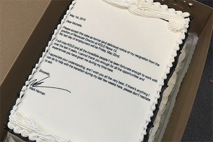 ԱՄՆ–ում «KOLD TV» հեռուստաընկերության հեռարձակման տնօրեն Մարկ Հերմանն աշխատանքից ազատման դիմումը գրել է տորթի վրա։ «New York Daily News»–ը հայտնում է, որ Արիզոնայի 28-ամյա բնակիչը, ով նոր աշխատանքի համար տեղափոխվում է այլ քաղաք, այդպիսով որոշել է մեղմել իր գործընկերների տխրությունը։ «KOLD TV»–ում Հերմանն աշխատել է 4 տարի։