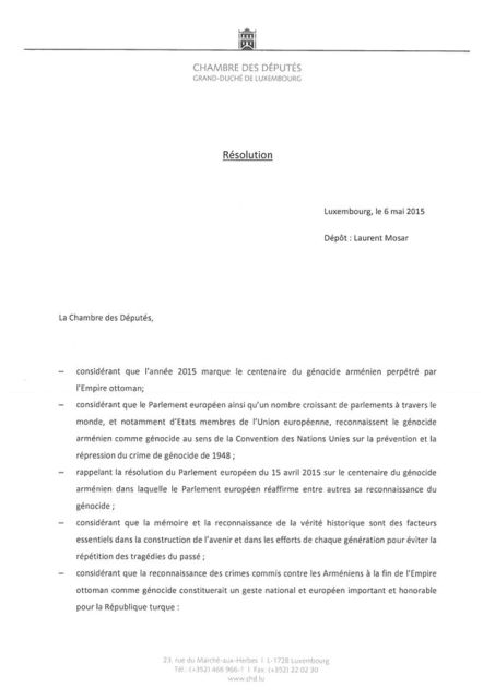 Լյուքսեմբուրգի Մեծ դքսության խորհրդարանը միաձայն ընունել է Հայոց ցեղասպանությունը ճանաչող բանաձև։