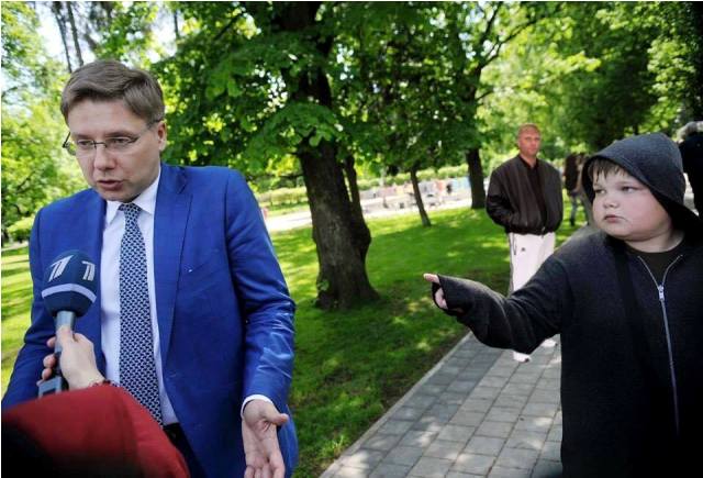 Ուշագրավ մրցույթի մասին է հայտարարել Լատվիայի մայրաքաղաք Ռիգայի քաղաքապետ Նիլ Ուշակովը: Իր ֆեյսբուքյան էջում քաղաքապետը նկար է տեղադրել, որում պատկերված է, թե ինչպես է նա հարցազրույց տալիս ռուսական հեռուստաալիքներից մեկի լրագրողին, իսկ այդ պահին նրա կողքին կանգնած տղան մատով է ցույց տալիս Ուշակովին։