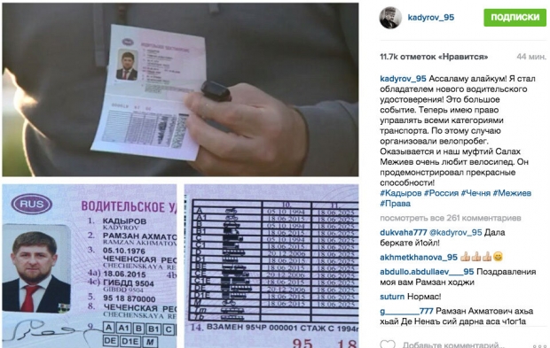 «Ես վարորդական նոր վկայական ստացա։ Սա մեծ իրադարձություն է։ Այժմ իրավունք ունեմ վարելու բոլոր կարգի տրանսպորտային միջոցները»,–ասել է Քադիրովը։