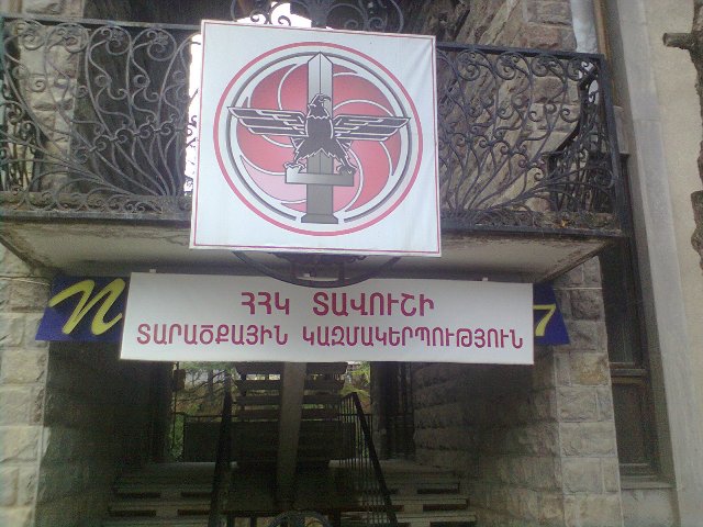 Լուսանկարում պատկերված է ՀՀԿ Տավուշի տարածքային կազմակերպության գրասենյակը: Լուսանկարից երևում է, որ ցուցանակը փակցված է մի այլ ցուցանակի վրա, որի վրա գրված է՝ «Night club 777»։