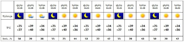 Օգոստոսի 2-6-ին սպասվում է առանց տեղումների եղանակ: Քամին՝ հարավային 2-5 մ/վրկ: Օդի ջերմաստիճանն էապես չի փոխվի: