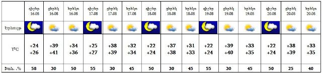 Օգոստոսի 16-20-ին հանրապետության տարածքը կգտնվի արևադարձային տաք օդային հոսանքների ազդեցության գոտում, հատկապես հովտային գոտիներում սպասվում է բարձր ջերմային ֆոն և բարձր կարգի հրդեհավտանգ իրավիճակ, գյուղատնտեսական մշակաբույսերի մոտ կդիտվի ջրազրկում, որից խուսափելու համար անհրաժեշտ է խիստ կերպով վերահսկել ոռոգման ռեժիմը:
