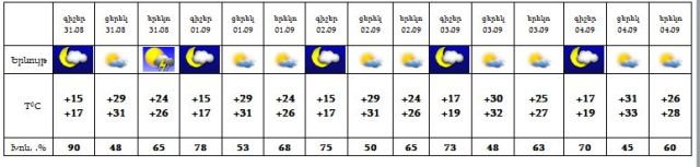 Օգոստոսի 31-ին երեկոյան ժամերին և գիշերը հնարավոր է ամպրոպ, անձրևի հավանականությունը փոքր է: