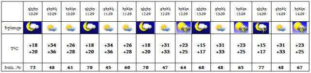 Սեպտեմբերի 10-11-ին սպասվում է առանց տեղումների եղանակ, 12-14-ի երեկոյան ժամերին և գիշերը հնարավոր է կարճատև անձրև և ամպրոպ: