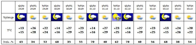 Սեպտեմբերի 29-30-ին, հոկտեմբերի 2-3-ին սպասվում է առանց տեղումների եղանակ, 1-ի երեկոյան ժամերին և գիշերը հնարավոր է կարճատև անձրև և ամպրոպ: