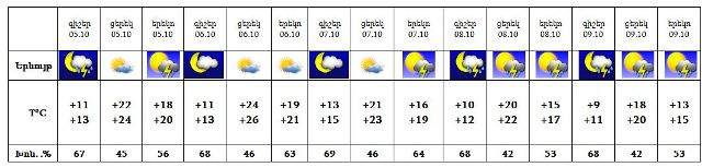 Հոկտեմբերի 5-ին, 7-9-ին‵ երեկոյան ժամերին և գիշերը սպասվում են կարճատև անձրև և ամպրոպ: 6-ին սպասվում է առանց տեղումների եղանակ: Ամպրոպի ժամանակ հնարավոր է քամու ուժգնացում‵ 16-18մ/վրկ: