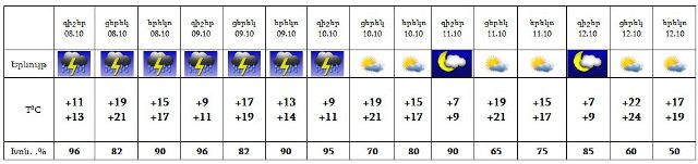 Հոկտեմբերի 8-9-ին, 10-ի գիշերը ժամանակ առ ժամանակ սպասվում է կարճատև անձրև և ամպրոպ, ամպրոպի ժամանակ հնարավոր է քամու ուժգնացում` 16-18մ/վրկ:
