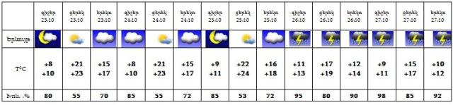 Հոկտեմբերի 23-25-ին սպասվում է փոփոխական ամպամածություն, օրվա երկրորդ կեսին կա թույլ անձրևի հավանականություն, 26-27-ին ժամանակ առ ժամանակ սպասվում է անձրև և ամպրոպ, ամպրոպի ժամանակ հնարավոր է քամու ուժգնացում` 16-18 մ/վրկ: