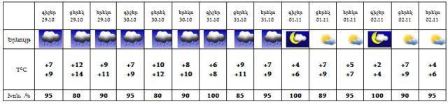Հոկտեմբերի 29-31-ին ժամանակ առ ժամանակ սպասվում է անձրև, նոյեմբերի 1-2-ին սպասվում է առանց տեղումների եղանակ: