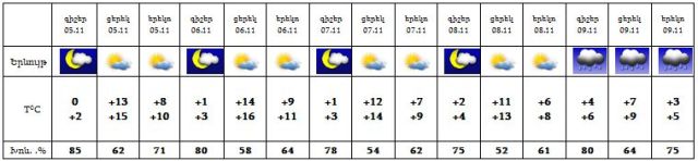 Նոյեմբերի 5-8-ին սպասվում է առանց տեղումների եղանակ, 9-ին ժամանակ առ ժամանակ սպասվում է անձրև: