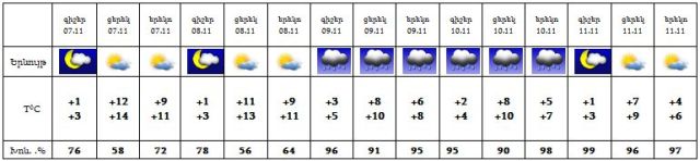 Նոյեմբերի 7-8-ին, 11-ին սպասվում է առանց տեղումների եղանակ, 9-10-ին ժամանակ առ ժամանակ սպասվում է անձրև: