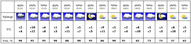 Նոյեմբերի 11-ին,12-ին, 14-ին հնարավոր է անձրև: 13-ին, 15-ին սպասվում է առանց տեղումների եղանակ: