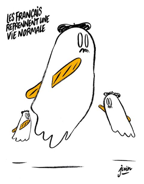Ծաղրանկարում պատկերված են ուրվականներ՝ գլխարկներով և բագետներով։ Ծաղրանկարը մակագրված է. «Ֆրանսիացիները վերադառնում են սովորական կյանքի»։