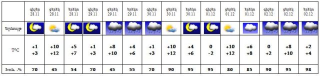 Նոյեմբերի 28-ին, 30-ի ցերեկը, դեկտեմբերի 1-ին սպասվում է առանց տեղումների եղանակ, 29-ի օրվա երկրորդ կեսին, 30-ի գիշերը, դեկտեմբերի 2-ին սպասվում են տեղումներ: