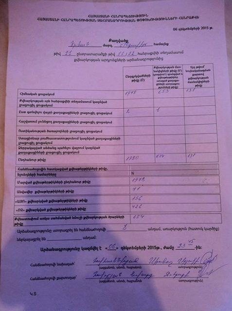 Ըստ արձանագրության՝ 11/22 ընտրատեղամասում Ոչ-ը 426 ձայնով հաղթել է, Այո-ն հավաքել է 156 ձայն, իսկ ԿԸՀ կայքում լրիվ հակառակ թվերն են` Ոչ-ը հավաքել է 156 ձայն։
