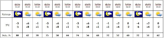 Օդի ջերմաստիճանը 11-13-ին էապես չի փոխվի, 14-ի գիշերը կբարձրանա 3-4 աստիճանով, 14-ի ցերեկը և 15-ի գիշերը կնվազի 4-5 աստիճանով: