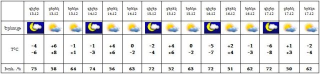 Օդի ջերմաստիճանը 13-ին էապես չի փոխվի, 14-ի գիշերը կբարձրանա 2-3, այնուհետև կնվազի 4-5 աստիճանով: